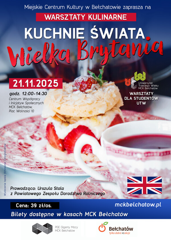 Zapraszamy serdecznie wszystkich studentów UTW na wyjątkowe warsztaty kulinarne pt. „Kuchnie świata:Wielka Brytania”, które odbędą się 21 listopada o godz. 12:00 w CWiIS, Plac Wolności 10. Pani Ula Stala z Powiatowego Zespołu Doradztwa Rolniczego podzieli się z Wami tajnikami brytyjskiej kuchni. W menu znajdą się takie pozycje jak: tosty angielskie, zapiekanka pasterska shepherd's pie oraz ciasto viktoria sponge.