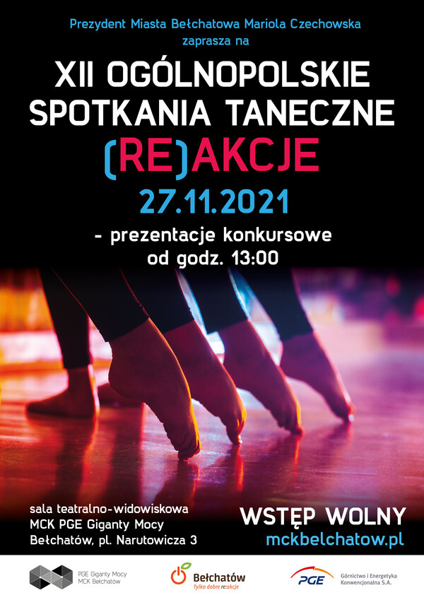 Prezydent Miasta Bełchatowa Miariola Czechowska zaprasza do udziału w XII Ogólnopolskich Spotkaniach Tanecznych (Re)akcje Bełchatów 2021. Prezentacje konkursowe odbędą się 27 listopada br., o godzinie 13:00 w sali teatralno - widowiskowej MCK PGE Giganty Mocy.