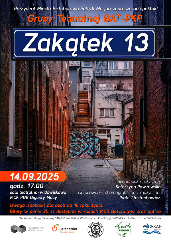 Prezydent Miasta Bełchatów Patryk Marjan zaprasza na spektakl pt. „Zakątek 13” w wykonaniu grupy teatralnej BAT-PKP, który odbędzie się 14 września 2025 r. o godzinie 17:00 w sali teatralno-widowiskowej MCK Giganty Mocy.