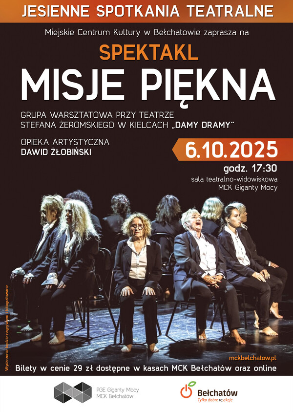 Miejskie Centrum Kultury w Bełchatowie zaprasza na spektakl w ramach Jesiennych Spotkań Teatralnych pt. „Misje piękna”, który odbędzie się 6 października 2025 r. o godzinie 17:30 w sali teatralno – widowiskowej MCK Giganty Mocy.