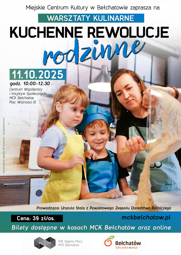 Miejskie Centrum Kultury zaprasza na warsztaty kulinarne pt. „Kuchenne rewolucje rodzinne”, które odbędą się 11 października 2025 r. o godzinie 10:00 w Centrum Współpracy i Inicjatyw Społecznych przy Placu Wolności 10.