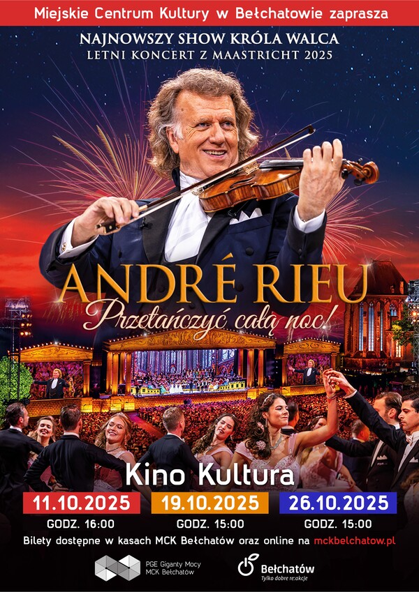 Miejskie Centrum Kultury w Bełchatowie zaprasza na niezapomniane show w Kinie Kultura! Na dużym ekranie pojawi się uwielbiany przez Was André Rieu. Kinowy koncert pt. „Przetańczyć całą noc!” będziecie mieli okazję zobaczyć: 11, 19, 26 października br. o godz. 15:00.