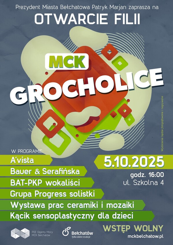 Prezydent Miasta Bełchatowa Patryk Marjan zaprasza na otwarcie filii MCK Grocholice. Wydarzenie odbędzie się 5 października br. o godzinie 16:00 w Grocholicach przy ulicy Szkolnej 4.