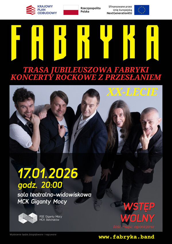 Miejskie Centrum Kultury w Bełchatowie zaprasza na Jubileuszowy koncert zespołu Fabryka, który odbędzie się 17 stycznia 2026 r. o godzinie 20:00 w sali teatralno-widowiskowej MCK Giganty Mocy.