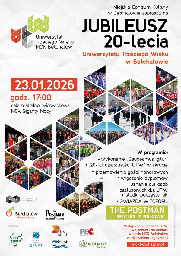 23 stycznia o godzinie 17:00 Miejskie Centrum Kultury w Bełchatowie stanie się miejscem wyjątkowego święta. Uniwersytet Trzeciego Wieku, działający przy MCK, obchodzi 20-lecie swojej działalności — dwie dekady spotkań, nauki, przyjaźni i nieustannej ciekawości świata.
