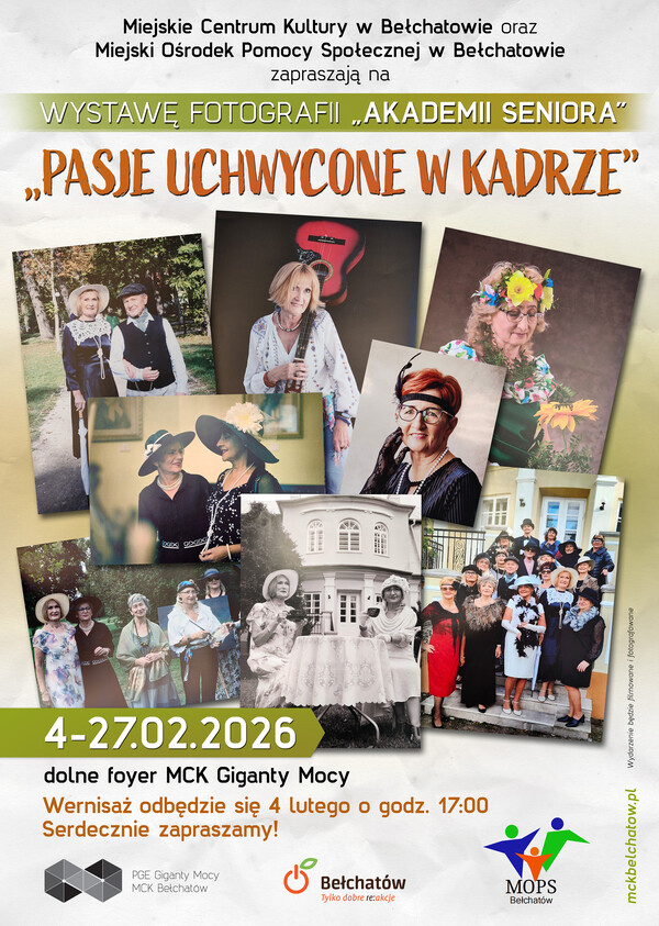 Miejskie Centrum Kultury oraz Miejski Ośrodek Pomocy Społecznej w Bełchatowie zapraszają na wernisaż wystawy „Pasje uchwycone w kadrze”, który odbędzie się 4 lutego br. o godzinie 17:00 na dolnym foyer MCK Giganty Mocy.