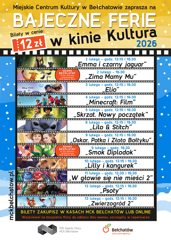Miejskie Centrum Kultury w Bełchatowie zaprasza dzieci, młodzież oraz całe rodziny na wyjątkowy cykl filmowy „Bajeczne Ferie w Kinie Kultura”, przygotowany specjalnie z okazji ferii zimowych. W czasie zimowego wypoczynku Kino Kultura stanie się miejscem pełnym barwnych bohaterów i niezapomnianych przygód na dużym ekranie.